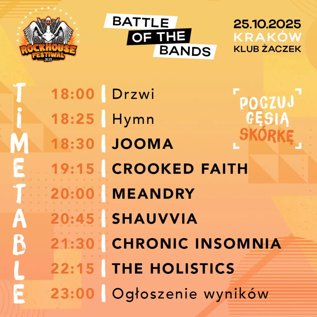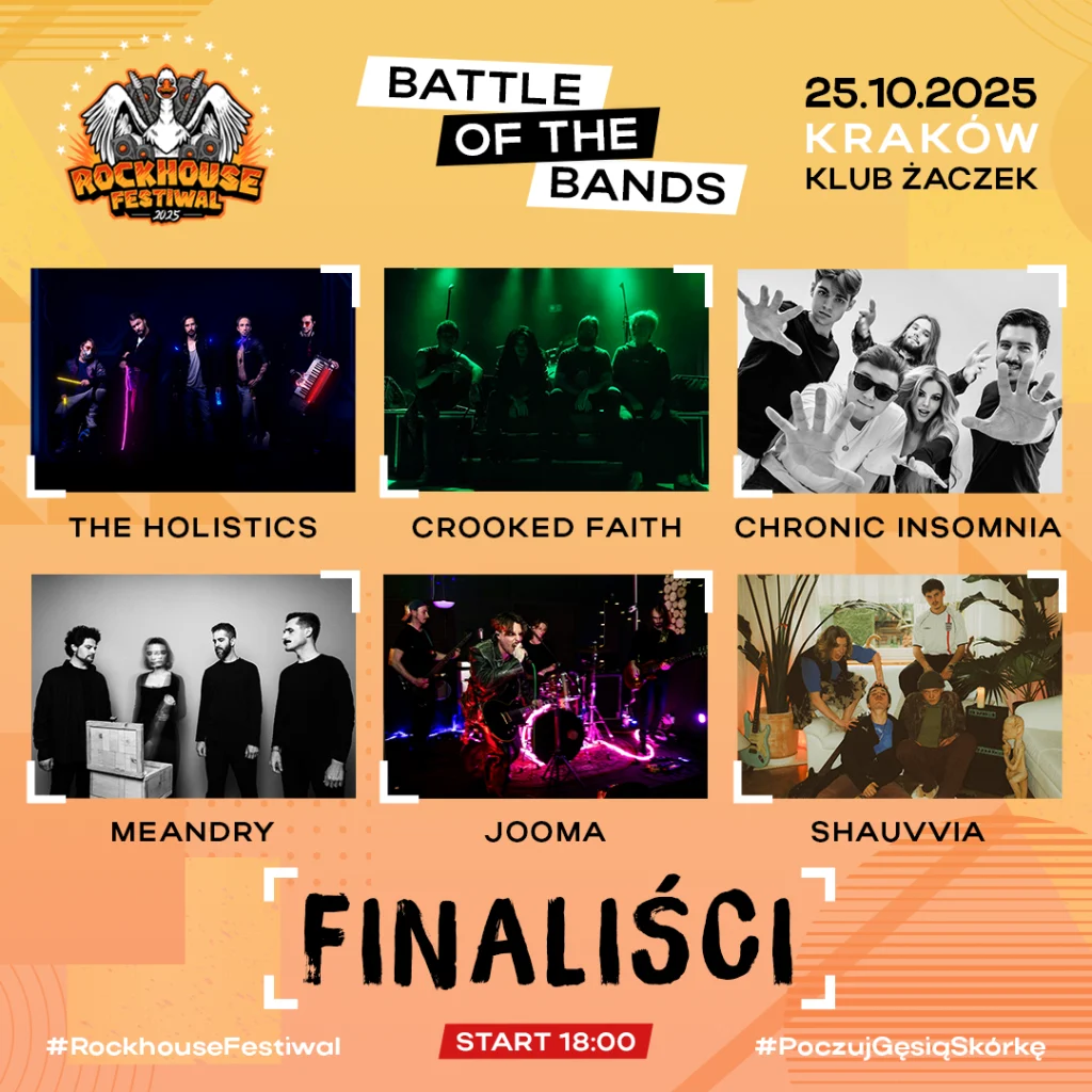 Rockhouse Festiwal to ekscytujący przegląd muzyczny promujący nowych utalentowanych artystów! Szykujcie się na spore emocje, mocne riffy i zespoły, które naprawdę mają coś do przekazania! Finałowe kapele wspólnie ocenia 4-osobowe profesjonalne jury oraz zgromadzona publiczność! A zwycięzca zgarnia kasę, nagrody rzeczowe, profesjonalną sesję nagraniową i Złotą Gęś! Wpadajcie, wspierajcie swoje ekipy i odkryjcie nowe brzmienia! Zapraszamy do Krakowa!